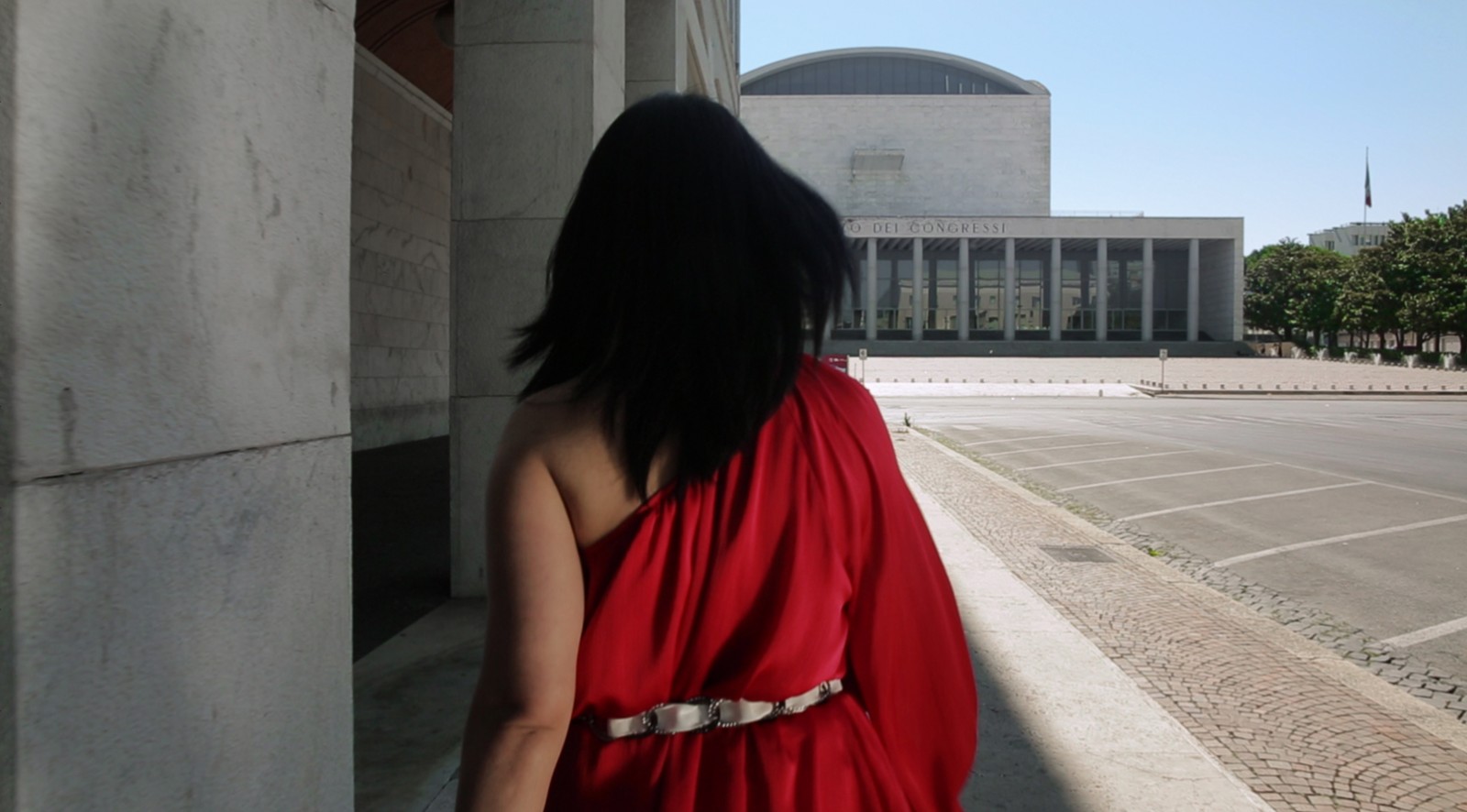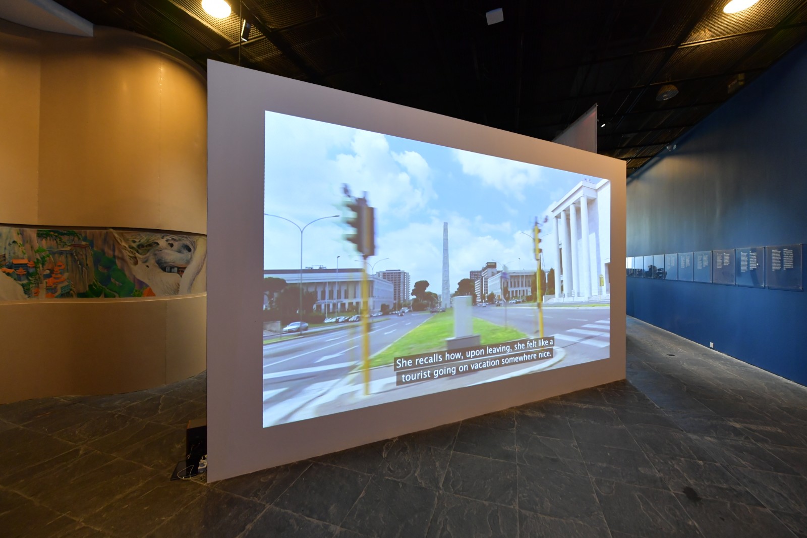 梅·海瑟格(Maj Hasager)《我們將在盲點相遇》是展覽呈現(xiàn)的最后一件作品,其講述了關(guān)于羅馬新城EUR區(qū)(Esposizione Universale di Roma)里的菲律賓移民的故事。這座由墨索里尼親自監(jiān)督設(shè)計的,以法西斯美學(xué)構(gòu)想出來的烏托邦城市,直至1960年才建成并被逐步被開發(fā)為羅馬新的富人區(qū)。海瑟格把眾多意大利導(dǎo)演在EUR區(qū)攝制的紀錄片、電影所刻畫的城市公共記憶,與這群定期在市中心一座教堂的地下室聚會的移民社群一同放入她的影像作品中,影像記錄了這個群體的閑暇時光,以一種個人的、私密的視角探索了菲律賓移民的私人記憶與生活如何融入并生存于這座有著強大歷史記憶的城市之中。正如約翰·伯格(John Berger)在《第七人》中的論述:“兩群不同的人在任何情況下,永遠都是共性大于差異性的。只是由于種種原因,環(huán)境蒙蔽了人們的眼睛。”[7]我們看得見的是歷史的記憶碾壓而過留下的軋痕以及其帶來的城市變遷,而看不見的是居于其中的人是如何在此種變遷中安放自我的記憶與故事。從這個立意來看,展覽所討論的議題似乎又回溯到了“公共”與“私人”,“歷史”與“記憶”之間的連接,然而涉及的場域已經(jīng)擴展到了一個城市或是一種文化以外。