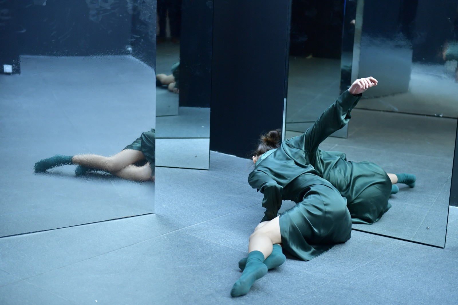 在OCAT研究中心展廳最明亮而寬闊的長走廊上,紙老虎工作室借助六個鏡面反射的三棱柱營造了一個劇場式的空間,邀請觀眾進入并參與到劇目的演繹與發(fā)展中來。鏡面反射著“我”和周圍的環(huán)境,清晰地呈現(xiàn)著“我”在環(huán)境中的位置。