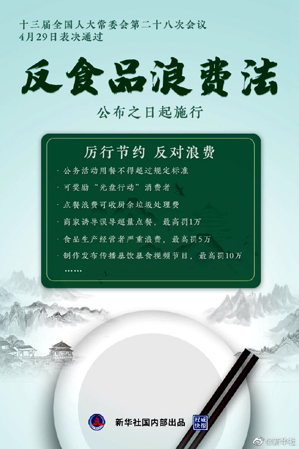 十三屆全國人大常委會第二十八次會議29日表決通過反食品浪費法,自公布之日起施行。弘揚傳統(tǒng)美德、保障糧食安全,防止食品浪費從此有法可依。(新華社記者羅沙 任沁沁 海報設(shè)計楊軼群)