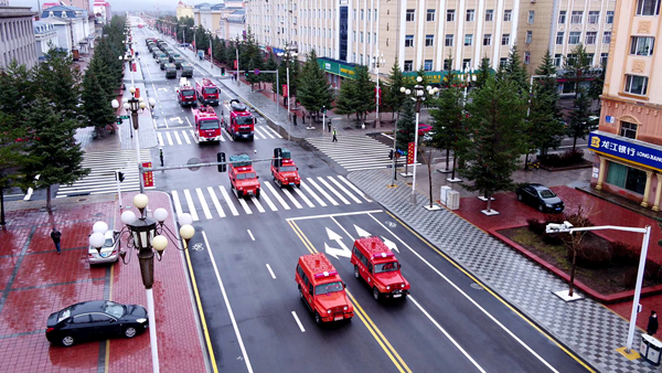 在漠河市城區(qū)主要街道,由防火指揮車、防火宣傳車、防火運(yùn)兵車等33臺車輛組成的反思巡游車隊(duì),長鳴防火警報(bào),繞市區(qū)緩慢行駛,通過聲勢浩大的宣傳,警醒廣大居民群眾以史為鑒,深刻反思“五?六”火災(zāi)帶來的慘痛教訓(xùn),讓森林防火時刻深入人心,嚴(yán)防森林火災(zāi)發(fā)生。在漠河市區(qū)開展巡游活動的同時,各鎮(zhèn)也同步組織開展了規(guī)模不同的“五·六”反思警示教育活動。