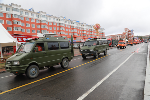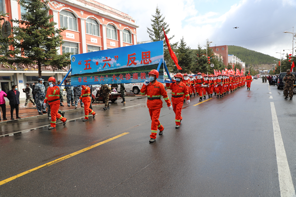 9時(shí),反思活動(dòng)正式開(kāi)始。林業(yè)局處級(jí)領(lǐng)導(dǎo)與職工群眾鄭重地在在“牢記歷史 汲取教訓(xùn) 振奮精神 開(kāi)拓進(jìn)取 建設(shè)美麗藍(lán)莓小鎮(zhèn)”宣傳條幅上,鄭重地簽上了自己的名字。并舉行了聲勢(shì)浩大的人員游行、車輛游行。由運(yùn)兵車、運(yùn)兵車、人工增雨車等26臺(tái)特種車輛,拉響警報(bào),緊跟在由森林消防大隊(duì)組成的100余人步行方陣后,他們身穿防火戰(zhàn)斗服,手舉寫(xiě)有“‘五?六’反思”巨型防火宣傳牌和防火宣傳彩旗,尤其是手執(zhí)高速渦流噴射滅火機(jī)、脈沖槍、斯蒂爾風(fēng)力滅火機(jī)的隊(duì)員,邁著整齊的步伐,喊著響亮的口號(hào),立即吸引了過(guò)往的居民的注意,成為最亮眼的“明星”。