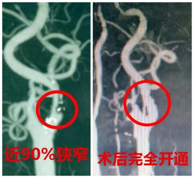 在神經(jīng)外一科醫(yī)護(hù)團(tuán)隊(duì)的精心管理及護(hù)理下,張大爺術(shù)后第二天即可下地活動(dòng),肢體反復(fù)癱瘓等癥狀消失,并且左眼視物不清的癥狀消失。復(fù)查頸部CTA檢查,左側(cè)頸內(nèi)動(dòng)脈管徑完全恢復(fù)正常,避免了腦卒中發(fā)生的危險(xiǎn)。