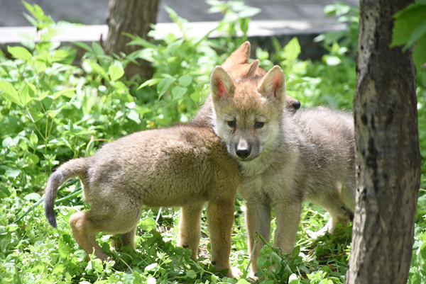 比起 “獨(dú)生子”的小羚羊,在狼散放區(qū)出生的小家伙們可真稱得上是大家庭了。同樣是四月份出生的狼崽們多達(dá)13只,新生娃數(shù)量目前在園里遙遙領(lǐng)先,他們分別來(lái)自于四個(gè)不同家庭,最多的一窩小狼崽有兄弟姐妹6個(gè),最少的也是雙胞胎。這13只小狼崽斷奶后過(guò)起了集體生活,每天一起吃飯,一起睡覺(jué),一起學(xué)習(xí),一起玩耍,簡(jiǎn)直不要太熱鬧。尤其是白天在室外運(yùn)動(dòng)場(chǎng)活動(dòng)時(shí),小狼崽們時(shí)而分成幾個(gè)小組活動(dòng),時(shí)而湊在一起,像一堆毛球擠成一團(tuán)。在這其中有一只小狼不到滿月就顯示出了狼王的天性,小尾巴翹的高高的,一幅天不怕地不怕的樣子誰(shuí)都敢挑戰(zhàn),勇敢值爆表。飼養(yǎng)員說(shuō)它具有狼王潛質(zhì),幾年后有可能成為新的狼王。