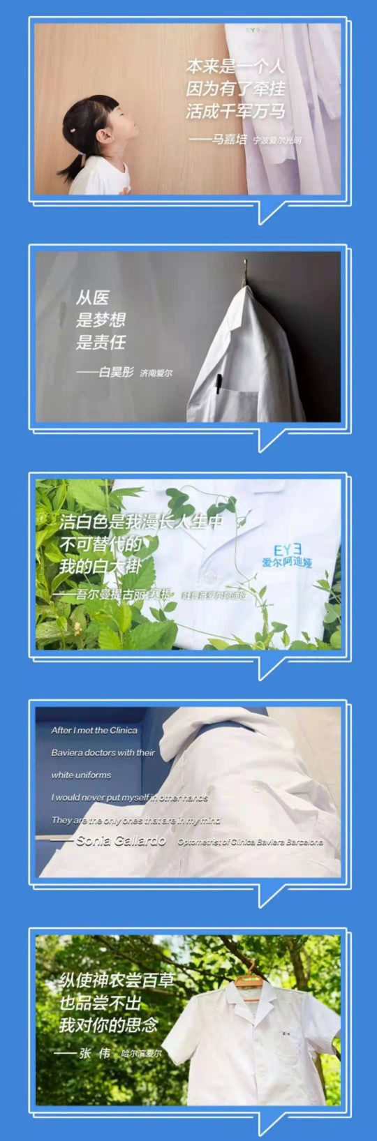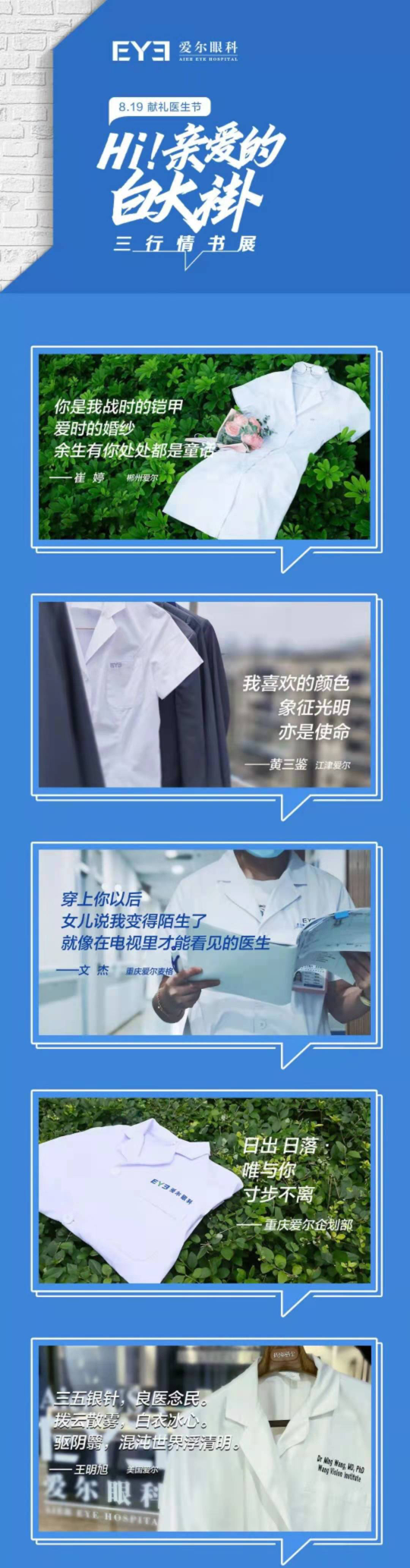 除了溫情脈脈、感動滿滿的系列微電影,愛爾眼科還啟動了醫(yī)師節(jié)“三行情書”征集活動。溫柔細(xì)致、多才多藝的醫(yī)生們,用他們或細(xì)膩、或豪放的筆觸,寫下了自己對“白大褂”真摯的情感。活動開展以來,共收到海內(nèi)外情書作品近2000件,最終此次活動共評選出“最美情書”、“最佳告白”共100個優(yōu)秀作品。(愛爾眼科)