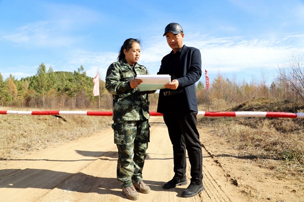 圖為紅旗林場第四管護站管護員孟祥茹(左)認真做好入山人員信息登記,實現(xiàn)了人員可追溯、可查詢