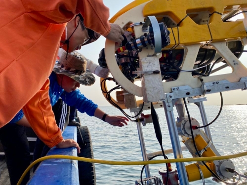 團隊多次海試結(jié)果顯示,在湍急的水流中,加足馬力的“海底法拉利”可以精準識別目標,從距離海底1.5米的高度緩緩降落,趨近目標,最后果斷出擊,牢牢將海鮮抓取。
