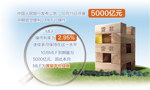 10月15日,月中“麻辣粉”(MLF)如期端出。中國人民銀行發(fā)布公告稱,為維護銀行體系流動性合理充裕,15日開展5000億元中期借貸便利(MLF)操作(含對10月15日MLF到期的續(xù)做)。MLF操作利率為2.95%,與9月持平,并連續(xù)多月保持在這一水平。10月MLF到期量為5000億元,因此本月MLF為等量平價續(xù)做。