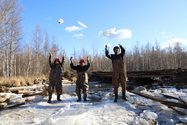 阿木爾林業(yè)局多種經(jīng)營(yíng)公司職工涉水檢查新建橋梁安全系數(shù)。
