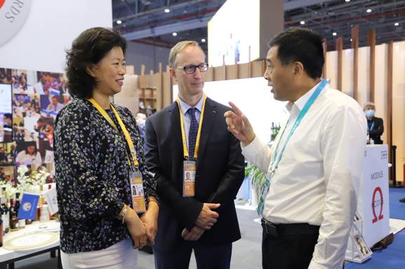 李軍、陳昱兩位集團(tuán)公司領(lǐng)導(dǎo)走進(jìn)北極冰藍(lán)莓酒莊設(shè)立在法國FIWA的站臺,向FIWA國際大獎賽主席、法國國際品評鑒定酒類專家協(xié)會主席奧利維耶·布什,以及法國FIWA SAS股份有限公司總裁張莉推介了參展的藍(lán)莓冰酒、藍(lán)莓雪酒等產(chǎn)品在剛剛結(jié)束的義烏森博會受到客戶青睞情況,尤其是重點(diǎn)介紹了大興安嶺地處祖國最北方,日照時(shí)間長,晝夜溫差大,天然純降水,生長出野生藍(lán)莓具有花青素含量高的特點(diǎn),其產(chǎn)品藍(lán)莓冰酒、藍(lán)莓白蘭地等在法國國際葡萄酒大獎賽、有機(jī)葡萄酒大獎賽和烈酒大獎賽上斬獲大金獎、金獎。