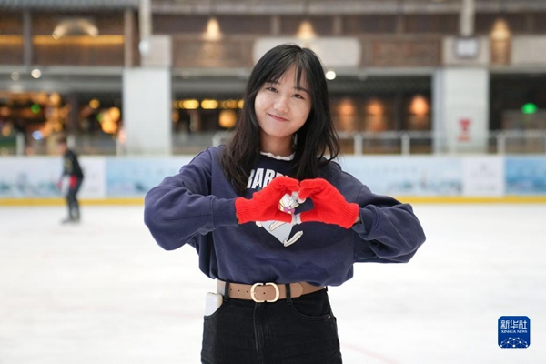 清華大學(xué)的學(xué)生志愿者王夢(mèng)齡在清華大學(xué)“冬奧精神與青年志愿”課程上體驗(yàn)滑冰(12月14日攝)。