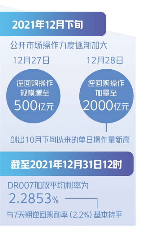 2021年末,中國人民銀行連續(xù)“加碼”公開市場操作。2021年12月31日,人民銀行發(fā)布公告稱,為維護年末流動性平穩(wěn),當日以利率招標方式開展了1000億元逆回購操作,期限為7天,利率維持在2.20%。這已是央行連續(xù)4個工作日開展千億級逆回購。