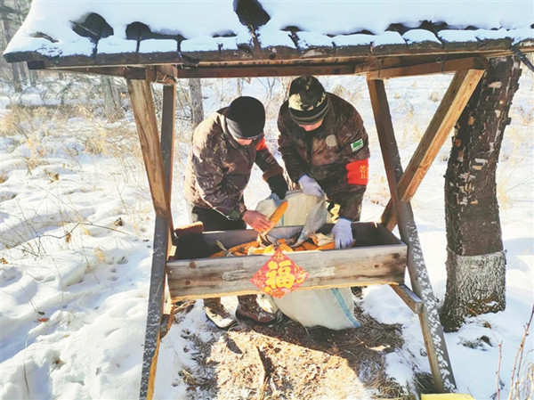 同一時間,青山林場的巡護隊員來到53林班補飼點,貼福字,送“年貨”。“這過年了,狍子野豬的食物也得提檔升級。咱們過年吃餃子,它們也得吃點好的?!标爢T王振林邊擺放著玉米、豆餅粉、白菜、蘿卜等食物邊調(diào)侃著。