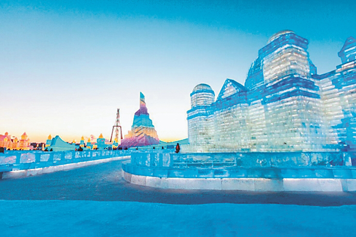 雪是潔白無瑕的,冰是晶瑩剔透的。在世界最大冰雪主題樂園——哈爾濱冰雪大世界,冰雪可以是五彩斑斕的。這些取材于松花江面的大冰塊,在白天展現(xiàn)了冰與雪的極致浪漫,宏偉的冰體建筑晶瑩剔透,雪雕作品潔白如玉。待到夜幕降臨,周圍旖旎的燈光亮起,七彩琉璃閃耀著璀璨的光芒,照亮了冰城上空。