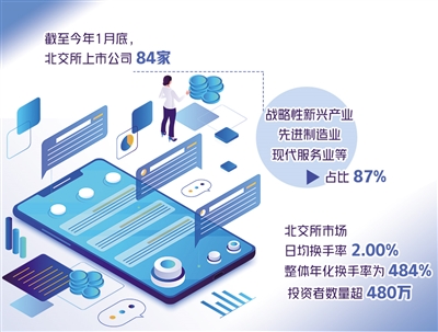 2021年11月15日,北京證券交易所正式揭牌開市,截至目前已滿3個月。記者日前獲悉,截至2022年1月底,北交所上市公司84家,戰(zhàn)略性新興產(chǎn)業(yè)、先進制造業(yè)、現(xiàn)代服務(wù)業(yè)等占比87%;新三板創(chuàng)新層掛牌公司1221家、基礎(chǔ)層掛牌公司5694家,呈現(xiàn)出“金字塔”結(jié)構(gòu)。目前,符合北交所上市財務(wù)條件的掛牌公司超過千家。