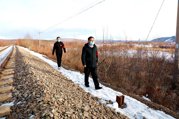 阿木爾林業(yè)局護(hù)路人員巡護(hù)鐵路線路安全(王力 攝)
