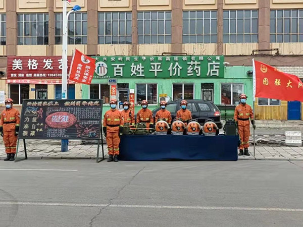 圖強(qiáng)林業(yè)局設(shè)立定點(diǎn)宣傳臺(tái),通過展板和森林防滅火裝備向群眾普及森林防火常識(shí)(趙明 攝)