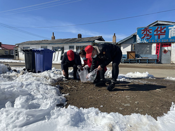 大烏蘇林場干部職工在市場集中區(qū)清撿煙頭(汝愛麗 攝)