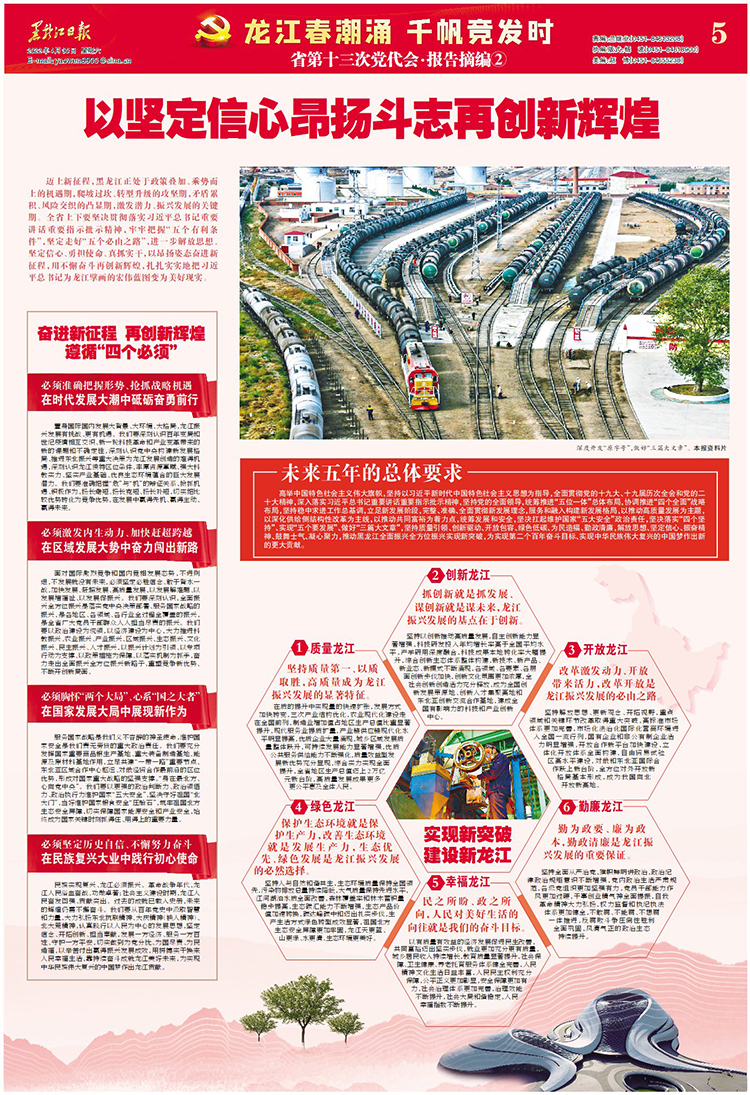 邁上新征程,黑龍江正處于政策疊加、乘勢而上的機(jī)遇期,爬坡過坎、轉(zhuǎn)型升級的攻堅(jiān)期,矛盾累積、風(fēng)險交織的凸顯期,激發(fā)潛力、振興發(fā)展的關(guān)鍵期。全省上下要堅(jiān)決貫徹落實(shí)習(xí)近平總書記重要講話重要指示批示精神,牢牢把握“五個有利條件”,堅(jiān)定走好“五個必由之路”,進(jìn)一步解放思想、堅(jiān)定信心、勇?lián)姑?、真抓?shí)干,以昂揚(yáng)姿態(tài)奮進(jìn)新征程,用不懈奮斗再創(chuàng)新輝煌,扎扎實(shí)實(shí)地把習(xí)近平總書記為龍江擘畫的宏偉藍(lán)圖變?yōu)槊篮矛F(xiàn)實(shí)。