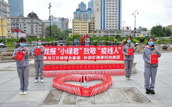 5月27日,由黑龍江日報報業(yè)集團和哈爾濱秋田虹健康科技集團共同發(fā)起的“龍報‘小綠君’,致敬‘疫線人’”系列公益活動,在哈爾濱火車站南廣場正式啟動。黑龍江日報報業(yè)集團、哈爾濱市委宣傳部、哈爾濱市公安局巡特警支隊、哈爾濱秋田虹健康科技集團領(lǐng)導(dǎo)出席啟動儀式。
