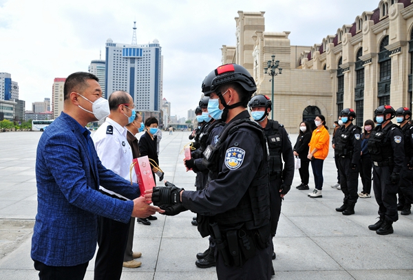 公益活動首批慰問對象是剛從抗疫一線歸來的哈爾濱市公安局巡特警支隊隊員。本次疫情期間,他們馳援五常市拉林鎮(zhèn)、哈爾濱市平房區(qū)和賓縣,先后核查車輛3700余臺,幫助群眾1100多人,為群眾配送餐食10萬余份、飲用水20余萬瓶、防疫物資9000余件,用血肉身軀筑起了抗擊疫情的鋼鐵長城,詮釋了“疫情當(dāng)前,特警在先”的使命擔(dān)當(dāng)?!案兄x黑龍江日報報業(yè)集團和愛心企業(yè)送來健康產(chǎn)品。今后我們會一如繼往做好本職工作,哪里需要哪里上,當(dāng)好人民的忠誠衛(wèi)士。”接過“小綠君”,哈爾濱市公安局巡特警支隊特警一大隊二中隊教導(dǎo)員劉甲洲一臉幸福。
