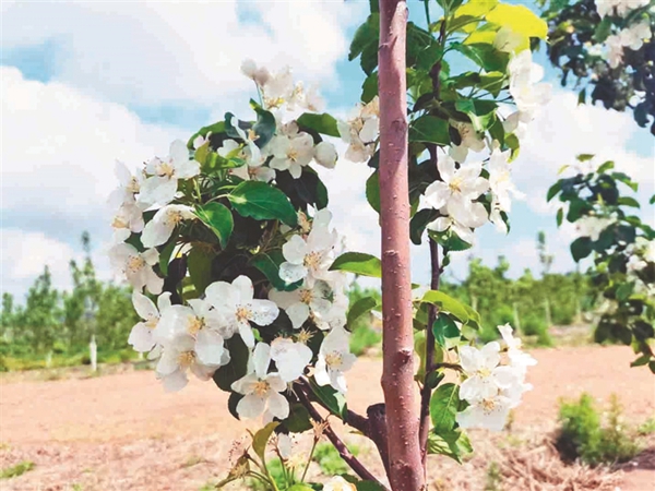 從尚志林場(chǎng)放眼望去,270畝寒地林果栽培示范基地在藍(lán)天白云的映襯下顯得頗為壯觀。龍豐、海棠、雞心果等萬余株寒地林果整齊排列,枝頭花朵競(jìng)相綻放。