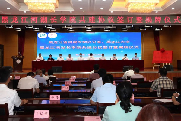 儀式上,省水利廳黨組書記、廳長、省河湖長制辦公室常務副主任侯百君和黑龍江大學校長付宏剛簽訂了共建協(xié)議,與黑龍江大學黨委書記王永清共同為黑龍江河湖長學院揭牌。