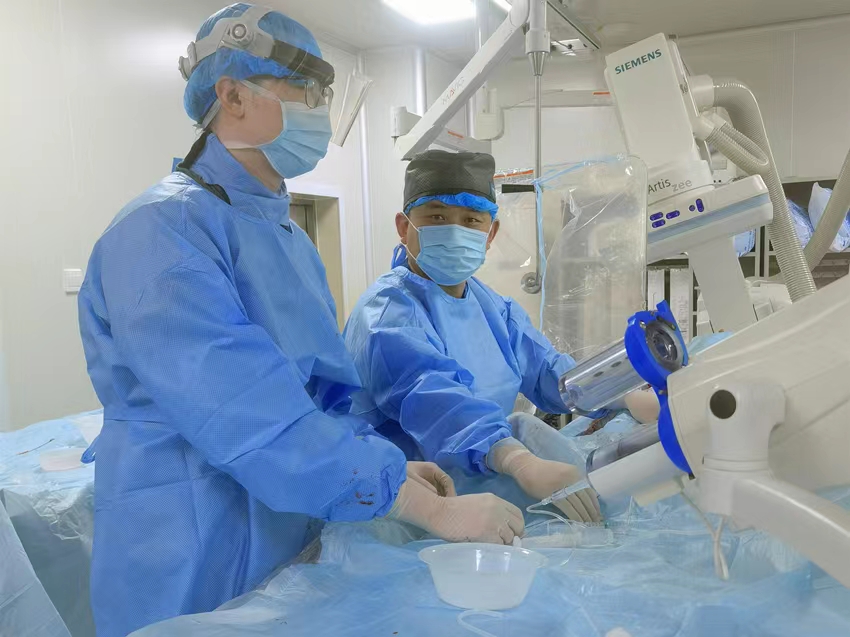 “患者入院后雖進(jìn)行了快速靜脈溶栓,但病情依然進(jìn)展性加重,我們發(fā)現(xiàn)患者病情為顱內(nèi)主干血管閉塞導(dǎo)致,情況十分危急,如果不及時介入開通閉塞的顱內(nèi)大血管,一旦錯過治療最佳時機(jī),患者就可能會出現(xiàn)危及性命等情況。”毛鐵副主任醫(yī)師回憶了當(dāng)時搶救情景。搶救刻不容緩,在爭得家屬同意并簽字后,神經(jīng)介入團(tuán)隊立即將張先生送至導(dǎo)管室進(jìn)行介入取栓治療。