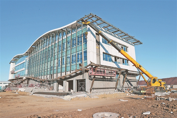 臨近立冬,黑河市氣溫已降至零下。在黑河市愛輝區(qū)上馬場鎮(zhèn),黑河寒區(qū)試車高新技術(shù)產(chǎn)業(yè)園項目仍在緊張建設(shè)。起重機吊起外墻造型鋼架,工人們在腳手架上拿著焊槍緊張作業(yè)。