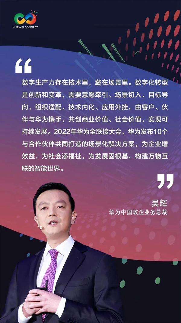 當(dāng)前,我國(guó)的數(shù)字化已經(jīng)進(jìn)入快車(chē)道,釋放數(shù)字生產(chǎn)力正當(dāng)其時(shí)。而“數(shù)字生產(chǎn)力就存在技術(shù)里,藏在場(chǎng)景里?!被诖耍A為中國(guó)政企業(yè)務(wù)總裁吳輝在會(huì)上發(fā)表了題為《為行業(yè)找技術(shù),深入場(chǎng)景創(chuàng)造價(jià)值》的主題演講,重點(diǎn)分享了華為基于多年的探索和實(shí)踐總結(jié)出的行業(yè)數(shù)字化轉(zhuǎn)型的方法論和企業(yè)轉(zhuǎn)型成功秘訣。