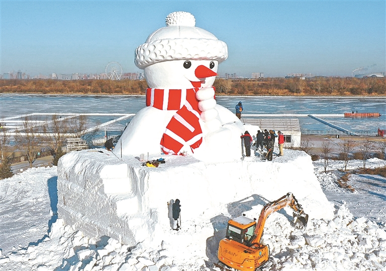 12月7日,哈爾濱市道里區(qū)群力江畔,一座巨型雪人已基本制做完成,工人在進(jìn)行收尾工作。雪人近20米高,黑眼睛,紅鼻子,戴著紅圍巾和白絨帽,手里拿著一大串糖葫蘆,笑容可掬,十分可愛。本報(bào)記者 蘇強(qiáng)攝