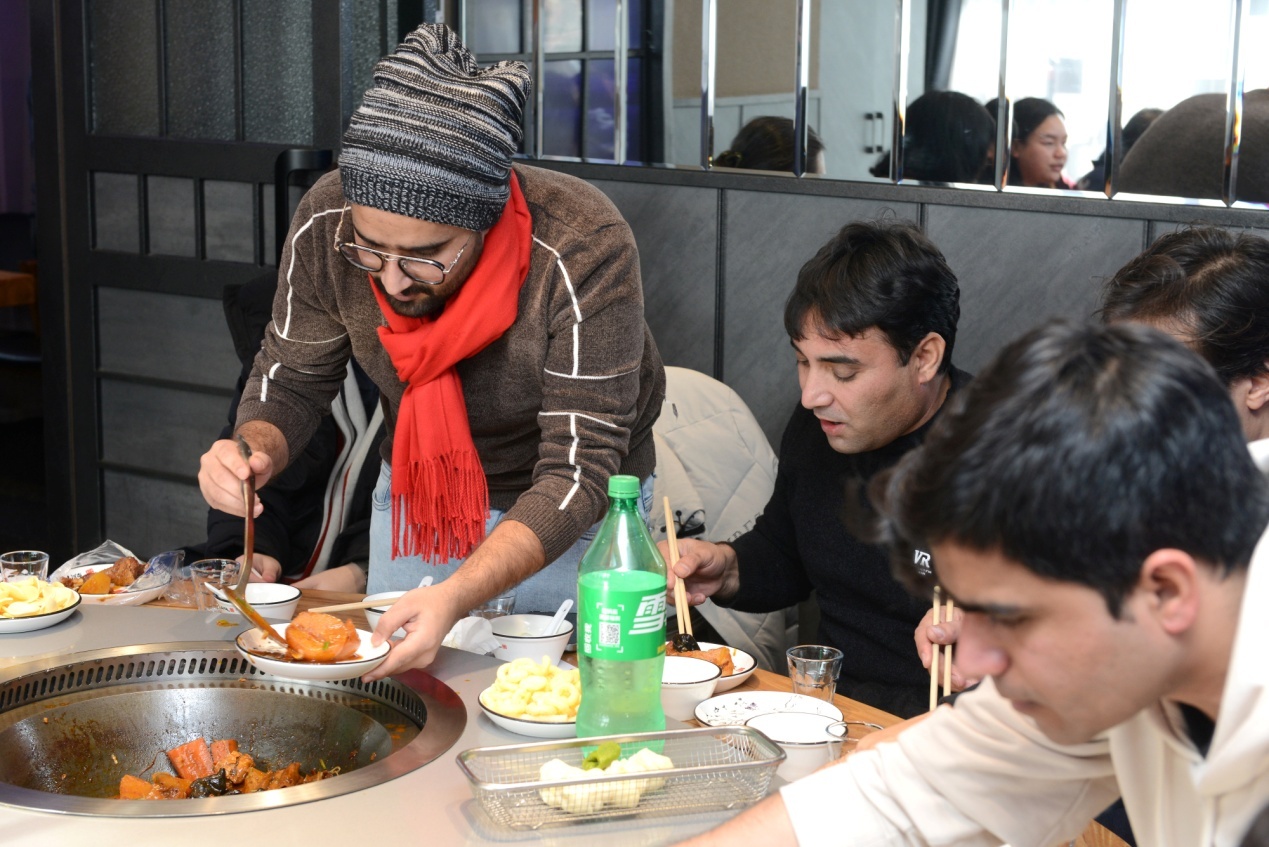 中午,留學生們品嘗了東北特色美食“鐵鍋燉”——鐵鍋燉大鵝、燉排骨,東北特色鍋包肉、拔絲地瓜讓留學生們感受了中華美食的魅力,大家紛紛贊嘆中華美食文化的博大精深,雖然遠離家鄉(xiāng),卻在熱氣騰騰的美食中感受到家的溫暖。品味美食的過程中,有的留學生穿上東北特色大花襖,有的穿上中國傳統(tǒng)服飾雪披風,系上花圍巾,大家喜不勝收,將中國元素展示給世界。