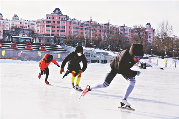 在中俄體育公園,8000平方米的滑冰場聚集了綏芬河市冰球運動愛好者和青少年速度滑冰愛好者,他們最小的6歲,最大的50多歲。在冰球運動展示活動中,頭戴球盔、身披護具的孩子們斗志昂揚,踏上冰場的他們?nèi)缤荣惖倪x手一樣,來去如風(fēng)穿梭自如,既帥又酷,團隊配合對抗激烈。剛在對方球門前射門,一眨眼工夫,球已經(jīng)到了另一方球門前。速度滑冰愛好者們你追我趕,激情享受這一北方冬天特有運動帶來的樂趣?;鶒酆谜咄跞鹫f:“我非常喜歡在冰上飛馳的感覺,我最喜歡冬天了,冬天會有冰場,大家可以在一起滑冰,一起交流,一起歡笑?!?/span>