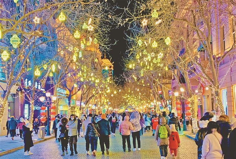 穿過歐式建筑,滿滿冰城風(fēng)情的彩燈以及年味十足的大紅燈籠將哈爾濱中央大街點(diǎn)亮。2023年新年伊始,百年老街呈現(xiàn)出游人如織的火熱場面,熟悉又熱鬧的氣氛彌漫在老街的各個角落,煙火氣持續(xù)升騰。欣賞唯美的陽臺音樂秀,品嘗鍋包肉、馬迭爾冰棍等特色美食,打卡“星空燈”、“雪妮妮網(wǎng)紅兔子”雪雕……游客和市民沉浸在一個個融合創(chuàng)意與冰城特色的冰雪玩法和體驗之中,盡情享受冰雪帶來的歡樂。數(shù)據(jù)顯示,僅春節(jié)期間,中央大街日均客流量維持在40萬人次,高峰時期達(dá)到70余萬人次。