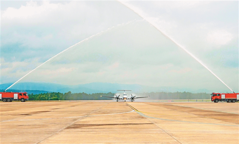 伴隨著飛機(jī)的轟鳴聲,命名為“林都號(hào)”的國王350飛機(jī)平穩(wěn)降落林都伊春,緩緩駛向林都機(jī)場(chǎng)5號(hào)停機(jī)坪。當(dāng)飛機(jī)落地脫離跑道后,左右兩側(cè)的消防車開始噴射水霧,兩束水霧相互交錯(cuò),以“水門禮”熱烈歡迎乘坐“林都號(hào)”來伊春的游客。