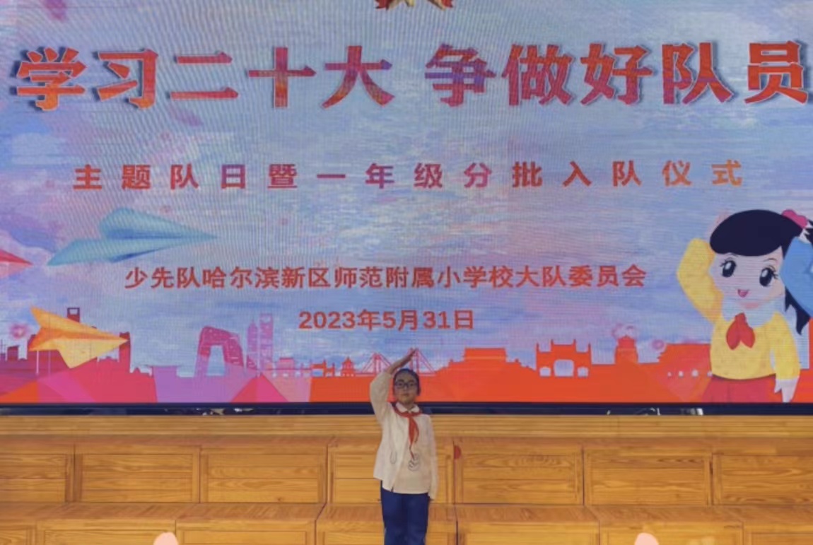 閆書諾同學(xué)來自哈爾濱新區(qū)師范附屬小學(xué)二年八班,在六一兒童節(jié)前夕,以優(yōu)異的成績成為學(xué)校2022級第一批中國少年先鋒隊隊員。