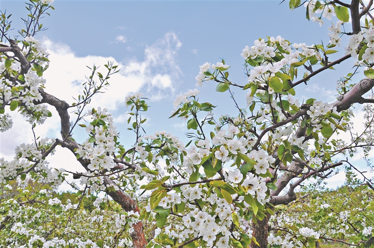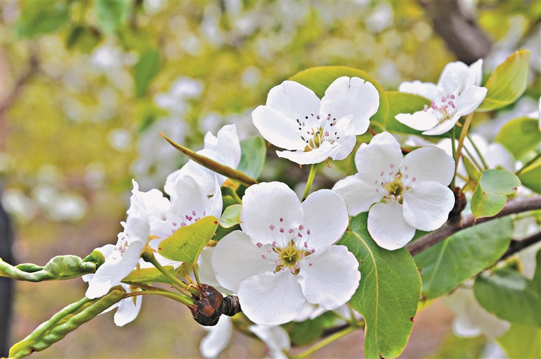 一場小雨過后,花瓣上、樹葉上一滴滴晶瑩剔透的水珠給梨樹增添了幾分韻味,梨花帶雨,讓人又憐又喜。漫步梨園,樹上朵朵梨花如雪,地面蒲公英花金黃,頭頂是湛藍(lán)的天空和朵朵白云,一只只繁忙的小蜜蜂在花間“起舞”。漫步其中,仿佛游走于一幅畫卷中,讓人只想留住這美麗的瞬間。