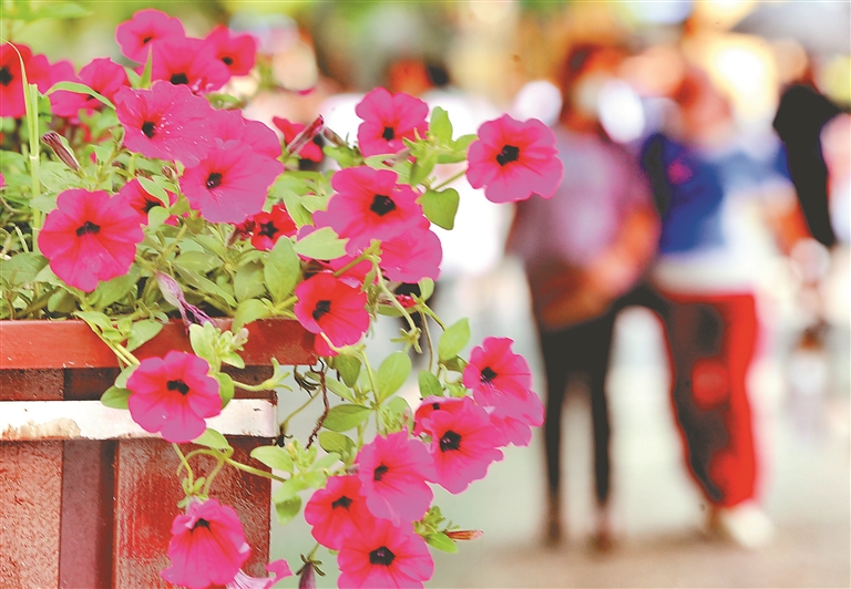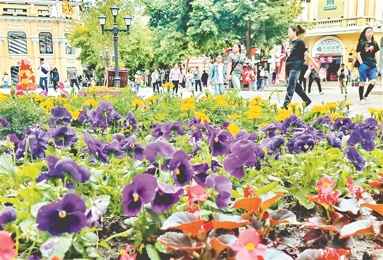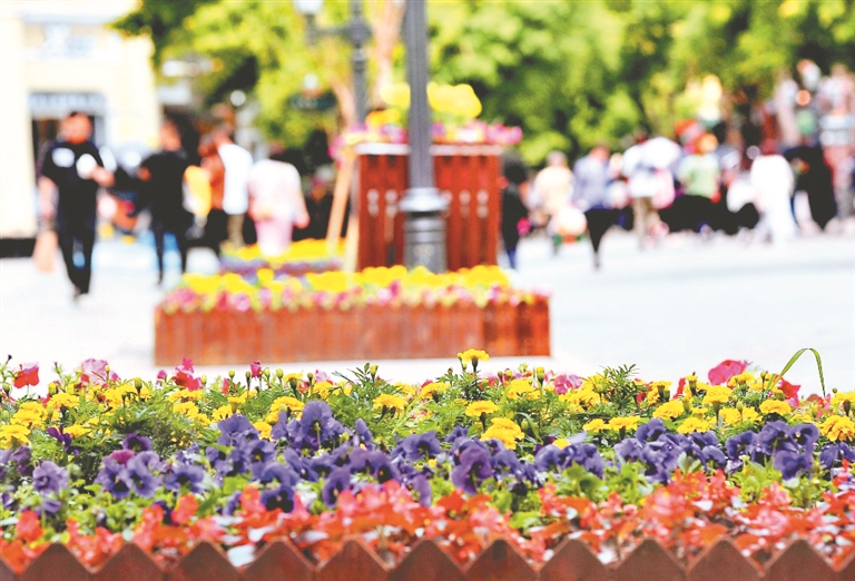 13日,哈爾濱市道里區(qū)中央大街上,行人從五彩繽紛的花卉旁走過。進(jìn)入夏季,來哈爾濱避暑游玩的游客不斷增多,為給游客打造一個舒適美麗的旅游環(huán)境,中央大街上種植了三色堇、金魚草、矮牽牛、四季海棠等多種花卉。這些鮮花姹紫嫣紅、爭奇斗艷,將整條街道裝點(diǎn)得十分靚麗。