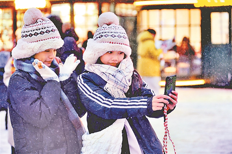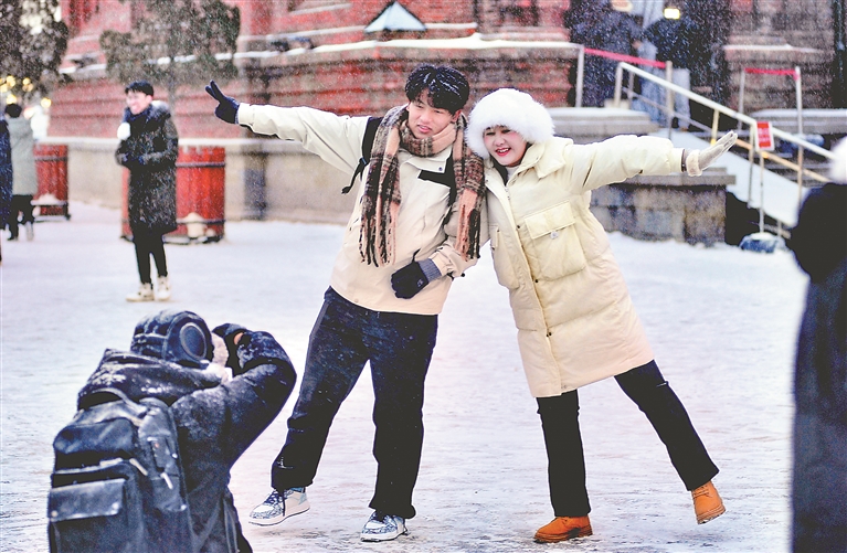 在各處景點,降雪讓游客們游玩興致更濃,大家紛紛在雪中拍照,記錄下精彩瞬間,感受降雪帶來的快樂。
