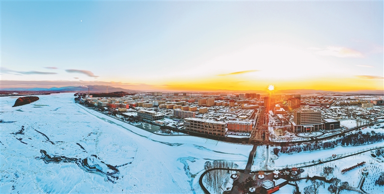 從饒河縣沿江公園俯瞰,烏蘇里江如同一條白色巨龍,靜止的江面盡展千里冰封的北國風光,江面上隆起的座座冰丘高低起伏、連綿不斷,在冬日夕陽的照耀下,映射出耀眼的光芒。