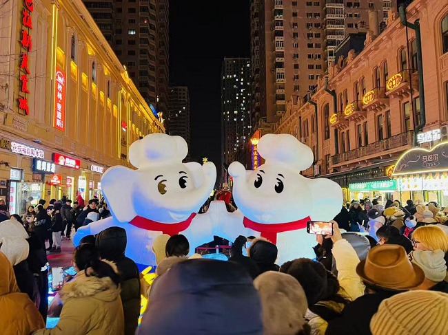 除了“白象”標(biāo)志性小象IP格外吸睛之外,因其與“對象”諧音的巧妙設(shè)計,也吸引著往來行人紛紛駐足。雪雕前人潮涌動,不少市民游客在“對象”前合影留念。這一創(chuàng)意不僅為游客增添別樣的溫暖與歡樂,也在社交媒體掀起一陣“找對象”的熱潮?;顒悠陂g,“對象雪雕走紅哈爾濱”的話題登上熱搜榜。不少網(wǎng)友調(diào)侃:“這就去哈爾濱找對象?!币灿腥吮硎荆赐晷∠笱┑?,感覺爾濱的冬天都充滿了浪漫的氣息。