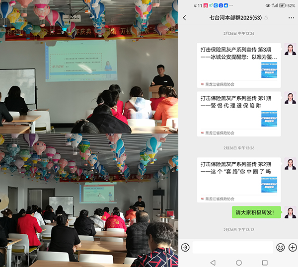 在此次打擊“代理退?!毙麄骰顒又校吲_河中支利用微信工作群、微信朋友圈轉發(fā)宣傳內容,詳細剖析了黑灰產(chǎn)的常見運作模式,非法“代理退?!笨赡芙o消費者帶來的四方面風險:一是資金受損風險;二是喪失正常保險保障的風險;三是個人信息泄漏風險;四是相關行為可能導致消費者面臨訴訟等法律風險。號召廣大群眾增強風險防范意識,警惕非法“代理退?!碧茁贰?