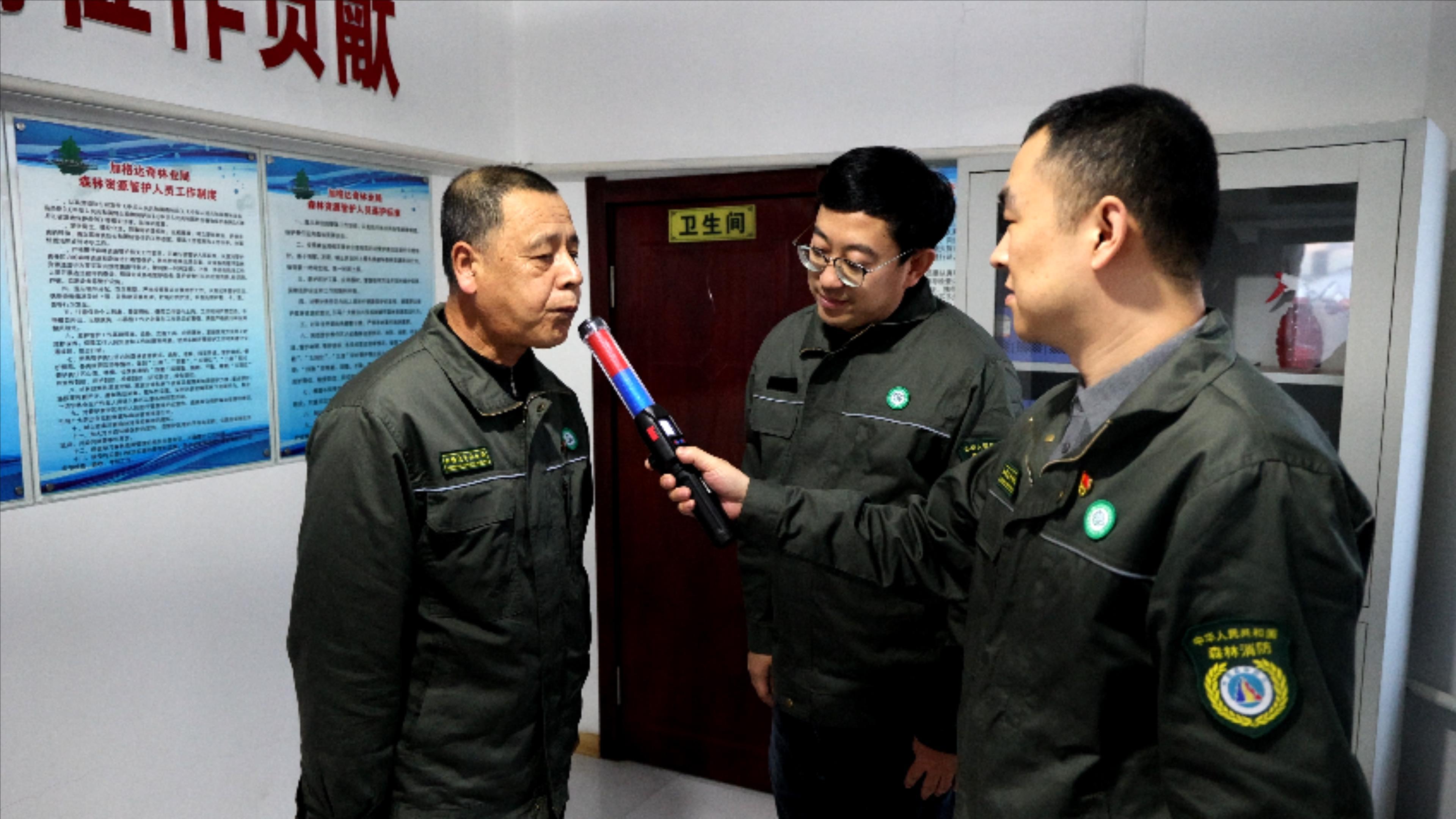 加格達奇林業(yè)局紀委工作人員正在對林場值班人員進行飲酒檢查(趙子敬 攝)