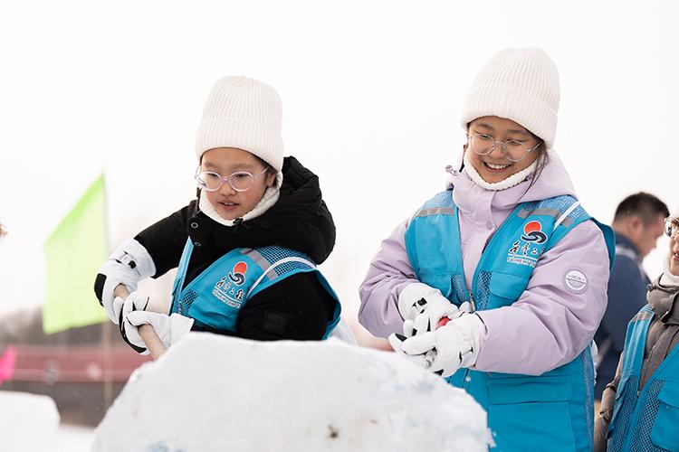 研學(xué)少年們走進小朱家村的人文與自然世界。小朱家村三面環(huán)水、毗鄰鏡泊湖的獨特地理位置,讓大家讀懂了這座村莊與冰雪的深厚淵源,而“村集體+企業(yè)+農(nóng)戶”的發(fā)展模式,更讓孩子們了解到“中國冰村”從冬閑小村蛻變?yōu)槲穆脽嵬恋牡儦v程。在冰封江畔,孩子們俯身細(xì)察冰層下縱橫交錯的裂縫與晶瑩剔透的氣泡,沉浸式感受冰雪的肌理;走進冰屋、觀賞冰人與冰掛景觀,仿佛踏入如夢似幻的冰雪童話世界;在專業(yè)老師的悉心指導(dǎo)下,研學(xué)少年們親手體驗冰雕創(chuàng)作,雕刻蘋果、桃子等水果冰雕,孩子們通過親身體驗,真切領(lǐng)略到冰雪藝術(shù)的獨特魅力,自然與人文的雙重滋養(yǎng)也在少年們的心中悄然扎根。