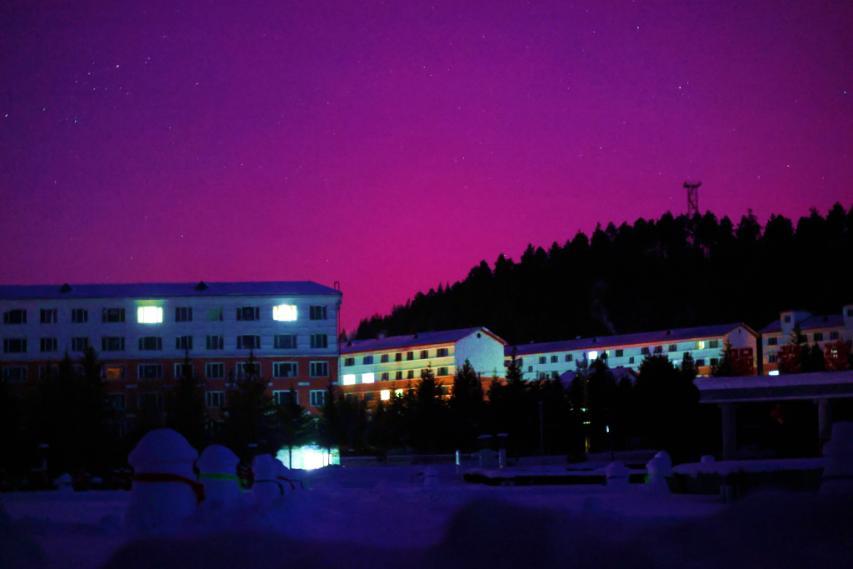 當(dāng)日清晨5時30分,阿木爾林業(yè)局北方天空悄然浮現(xiàn)橘紅色北極光,澄澈夜空中,流動的極光如彩綢漫舞,搭配漫天璀璨星河、靜謐連綿群山,還有城鎮(zhèn)里惺忪的燈光,共同勾勒出一幅夢幻綺麗的北國畫卷,裸眼即可清晰觀賞。當(dāng)?shù)鼐用裉婆康谝粫r間記錄下這一美景,難掩興奮:“往年總盼著夏至能拍到北極光,沒想到冬季也能邂逅這般盛景,親身感受宇宙的壯麗浩瀚,太幸運了!”