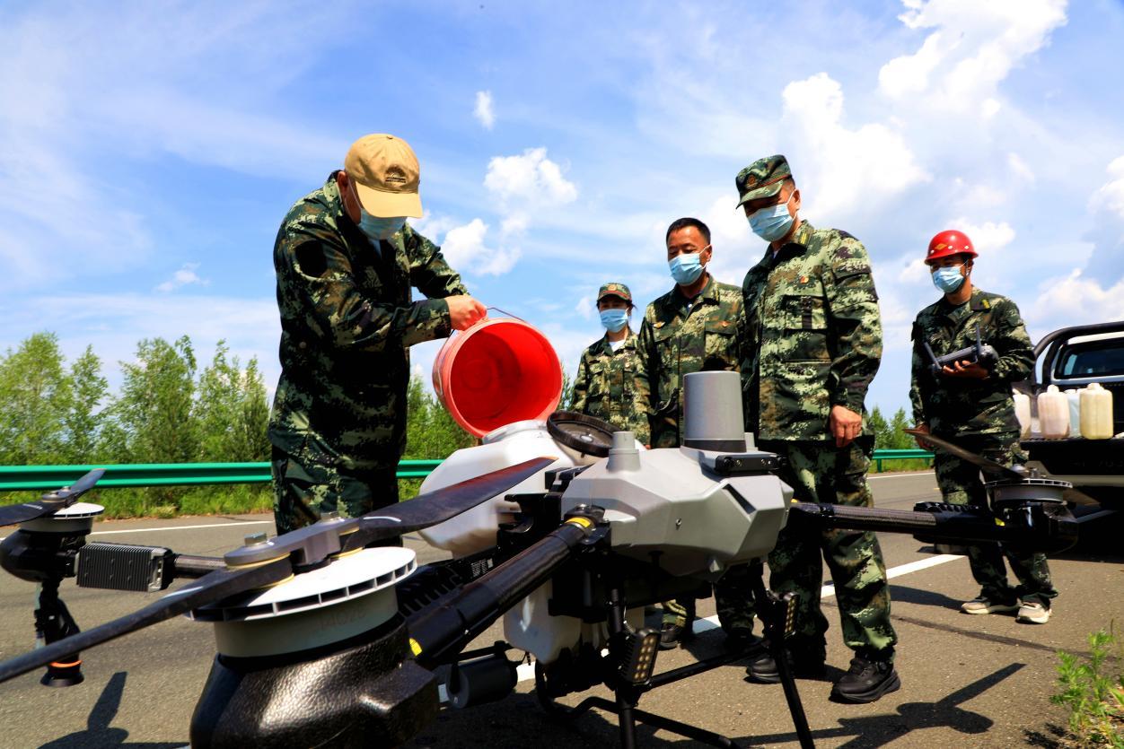 阿木爾林業(yè)局林防站工作人員為無人機添加防治藥液,防治樟子松梢斑螟(王力 攝)