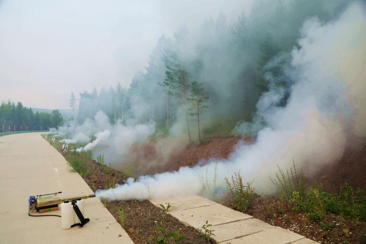 阿木爾林業(yè)局林防站聯(lián)合相關(guān)林場,點燃“百菌清”煙劑,防治“早落病”效果(王力 攝)