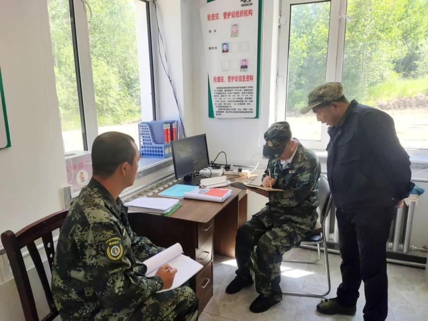 林業(yè)局工作人員在查看管護站入山人員登記情況(張凱強 攝)
