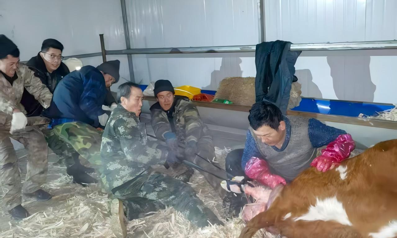 趕到牛棚時,發(fā)現(xiàn)一頭棕白花母牛臥在干草堆上,四肢抽搐,腹部劇烈起伏卻始終無法完成生產(chǎn)。 “別急,我們現(xiàn)在應該利用助產(chǎn)工具,現(xiàn)在必須立刻進行人工助產(chǎn)拖拽!” 民警一邊安撫養(yǎng)殖戶的情緒,一邊分工協(xié)作。兩個小時后,隨著母牛一聲響亮的低吼,在眾人的合力幫助下 ,小牛犢成功降生。