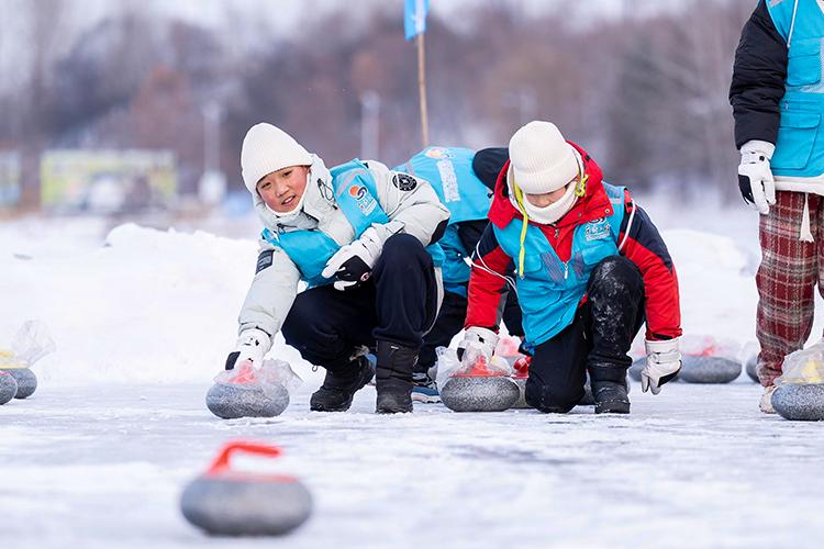希望與愛手拉手主題公益研學(xué)活動(dòng)中,孩子們玩室外冰壺
