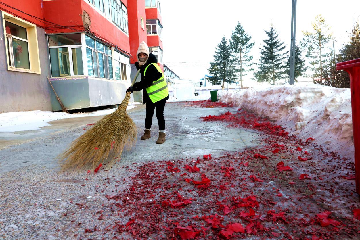 2月16日8點(diǎn),大街小巷年味正濃,鞭炮紙屑散落各處,行人寥寥。身穿黃馬甲的林業(yè)局環(huán)衛(wèi)工人已穿梭在街頭,帽子、睫毛凝滿白霜,手中掃帚不停揮舞,將鞭炮碎屑、生活垃圾及時(shí)清掃歸堆、裝車清運(yùn)。轉(zhuǎn)崗環(huán)衛(wèi)工人馬建民說:“我的責(zé)任區(qū)內(nèi)商戶多、居民多,春節(jié)期間工作量比平時(shí)多一倍,必須打掃干凈,讓大家過個(gè)舒心年?!痹谌w保潔員的奮戰(zhàn)下,居民區(qū)實(shí)現(xiàn)鞭炮紙屑隨放隨清、生活垃圾日產(chǎn)日清,大街小巷始終整潔有序。